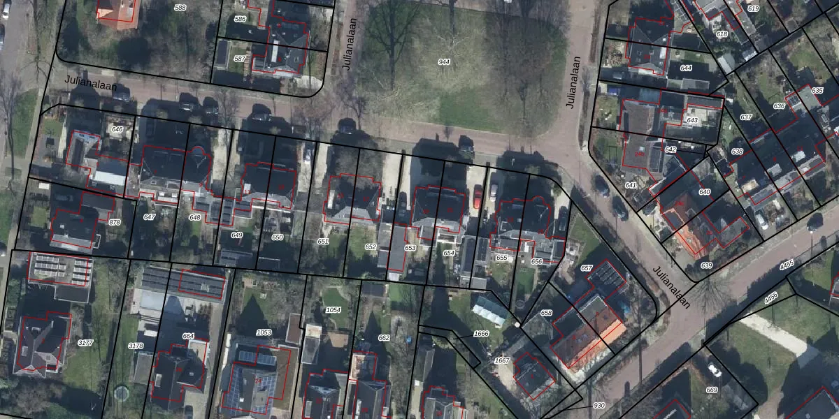 Julianalaan 19 is gelegen op kadastraal perceel TIE00H653. Deze kadastrale aanduiding is uniek en wordt gebruikt door het Kadaster om eigendomsrechten en andere zakelijke rechten vast te leggen. Het perceel maakt onderdeel uit van de kadastrale gemeente Tiel.