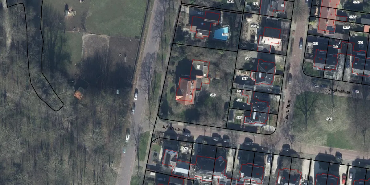 Julianalaan 4 is gelegen op kadastraal perceel TIE00H588. Deze kadastrale aanduiding is uniek en wordt gebruikt door het Kadaster om eigendomsrechten en andere zakelijke rechten vast te leggen. Het perceel maakt onderdeel uit van de kadastrale gemeente Tiel.