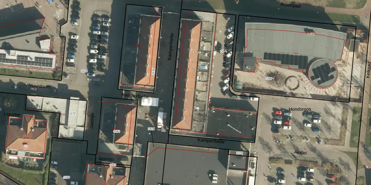 Het perceel waarop Kamperfoelie 12 staat heeft een oppervlakte van 2443 m². Dit is een zeer groot perceel. De perceeloppervlakte wordt geregistreerd door het Kadaster. Gedetailleerde informatie over de maten van dit perceel kunt u vinden in het rapport Kadastrale kaart met maatvoering van Kamperfoelie 12.