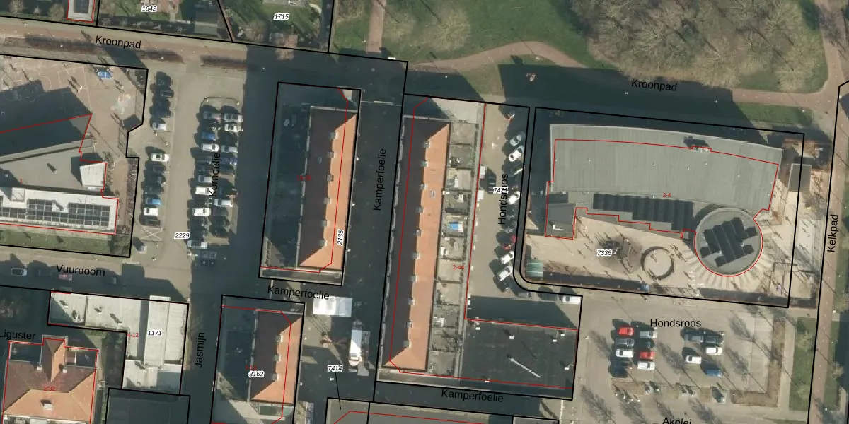 Het perceel waarop Kamperfoelie 16 staat heeft een oppervlakte van 2443 m². Dit is een zeer groot perceel. De perceeloppervlakte wordt geregistreerd door het Kadaster. Gedetailleerde informatie over de maten van dit perceel kunt u vinden in het rapport Kadastrale kaart met maatvoering van Kamperfoelie 16.