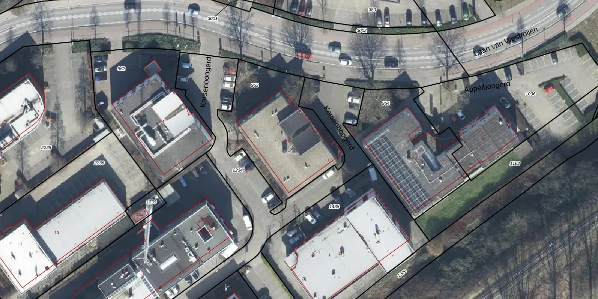 Het perceel waarop Kersenboogerd 5 staat heeft een oppervlakte van 1100 m². Dit is een zeer groot perceel. De perceeloppervlakte wordt geregistreerd door het Kadaster. Gedetailleerde informatie over de maten van dit perceel kunt u vinden in het rapport Kadastrale kaart met maatvoering van Kersenboogerd 5.