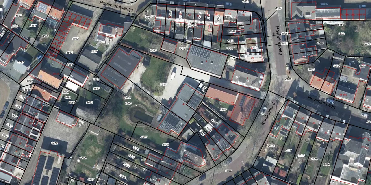 Het perceel waarop Konijnenwal 4-b staat heeft een oppervlakte van 965 m². Dit is een groot perceel. De perceeloppervlakte wordt geregistreerd door het Kadaster. Gedetailleerde informatie over de maten van dit perceel kunt u vinden in het rapport Kadastrale kaart met maatvoering van Konijnenwal 4-b.