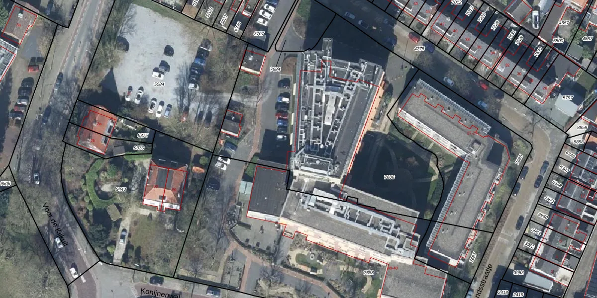 Het perceel waarop Konijnenwal 48-103 staat heeft een oppervlakte van 3161 m². Dit is een zeer groot perceel. De perceeloppervlakte wordt geregistreerd door het Kadaster. Gedetailleerde informatie over de maten van dit perceel kunt u vinden in het rapport Kadastrale kaart met maatvoering van Konijnenwal 48-103.