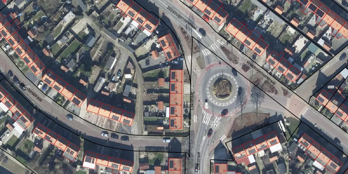 Het perceel waarop Lokstraat 29 staat heeft een oppervlakte van 8470 m². Dit is een zeer groot perceel. De perceeloppervlakte wordt geregistreerd door het Kadaster. Gedetailleerde informatie over de maten van dit perceel kunt u vinden in het rapport Kadastrale kaart met maatvoering van Lokstraat 29.