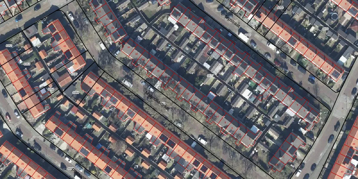 Het perceel waarop Magnoliastraat 20 staat heeft een oppervlakte van 7015 m². Dit is een zeer groot perceel. De perceeloppervlakte wordt geregistreerd door het Kadaster. Gedetailleerde informatie over de maten van dit perceel kunt u vinden in het rapport Kadastrale kaart met maatvoering van Magnoliastraat 20.