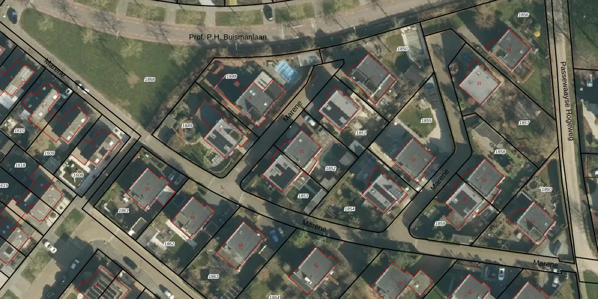Het perceel waarop Marene 11 staat heeft een oppervlakte van 374 m². Dit is een groot perceel. De perceeloppervlakte wordt geregistreerd door het Kadaster. Gedetailleerde informatie over de maten van dit perceel kunt u vinden in het rapport Kadastrale kaart met maatvoering van Marene 11.