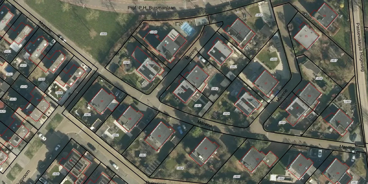 Het perceel waarop Marene 13 staat heeft een oppervlakte van 364 m². Dit is een groot perceel. De perceeloppervlakte wordt geregistreerd door het Kadaster. Gedetailleerde informatie over de maten van dit perceel kunt u vinden in het rapport Kadastrale kaart met maatvoering van Marene 13.