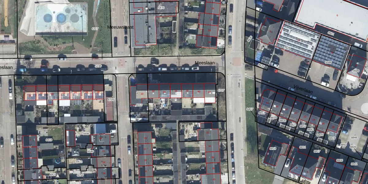 Het perceel waarop Meeslaan 38 staat heeft een oppervlakte van 7301 m². Dit is een zeer groot perceel. De perceeloppervlakte wordt geregistreerd door het Kadaster. Gedetailleerde informatie over de maten van dit perceel kunt u vinden in het rapport Kadastrale kaart met maatvoering van Meeslaan 38.