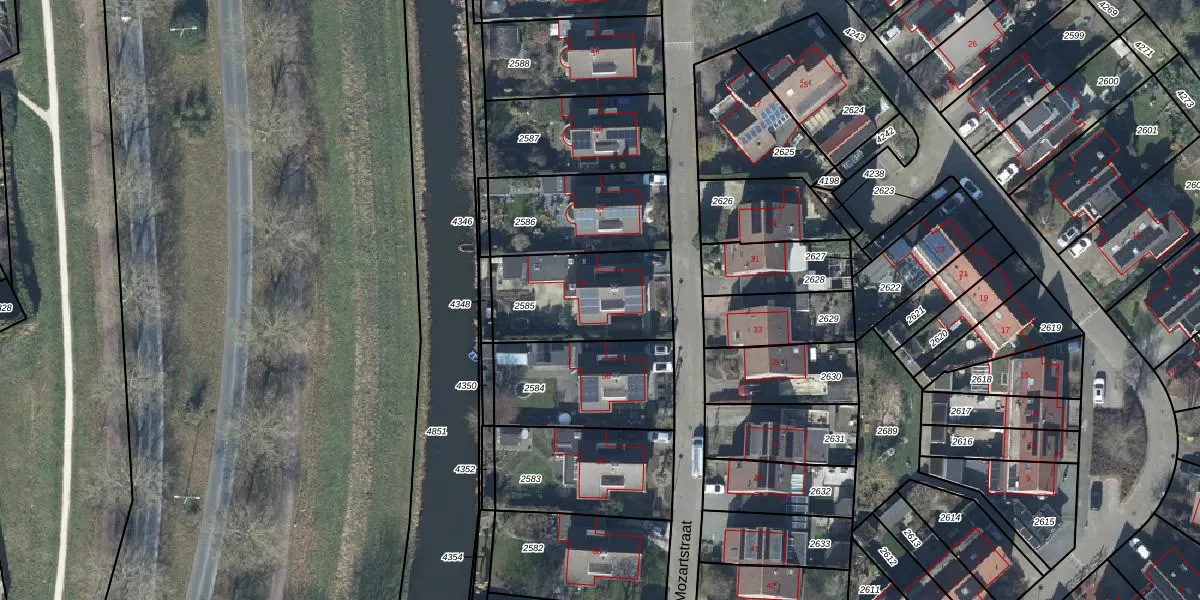 Mozartstraat 54 is gelegen op kadastraal perceel TIE00H2585. Deze kadastrale aanduiding is uniek en wordt gebruikt door het Kadaster om eigendomsrechten en andere zakelijke rechten vast te leggen. Het perceel maakt onderdeel uit van de kadastrale gemeente Tiel.