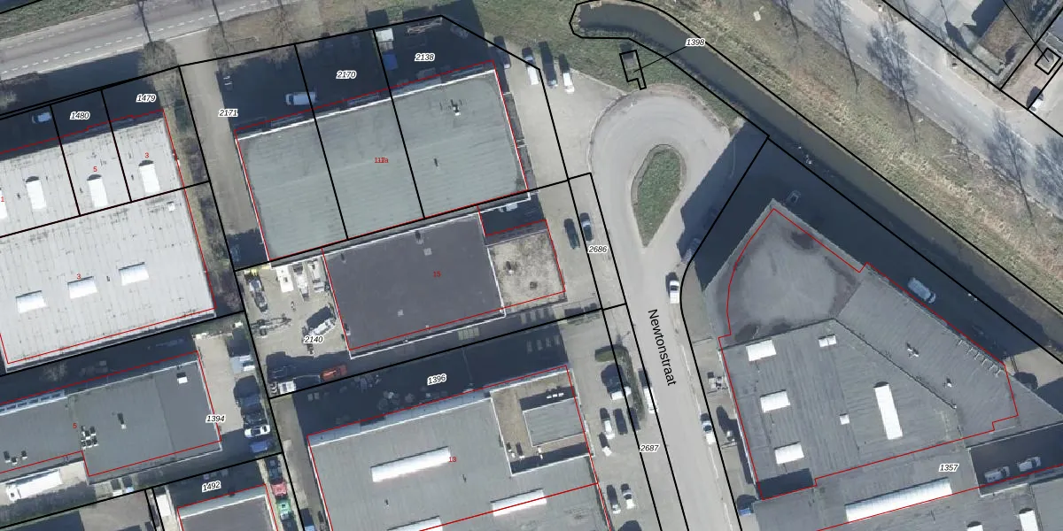 Het perceel waarop Newtonstraat 15 staat heeft een oppervlakte van 1615 m². Dit is een zeer groot perceel. De perceeloppervlakte wordt geregistreerd door het Kadaster. Gedetailleerde informatie over de maten van dit perceel kunt u vinden in het rapport Kadastrale kaart met maatvoering van Newtonstraat 15.