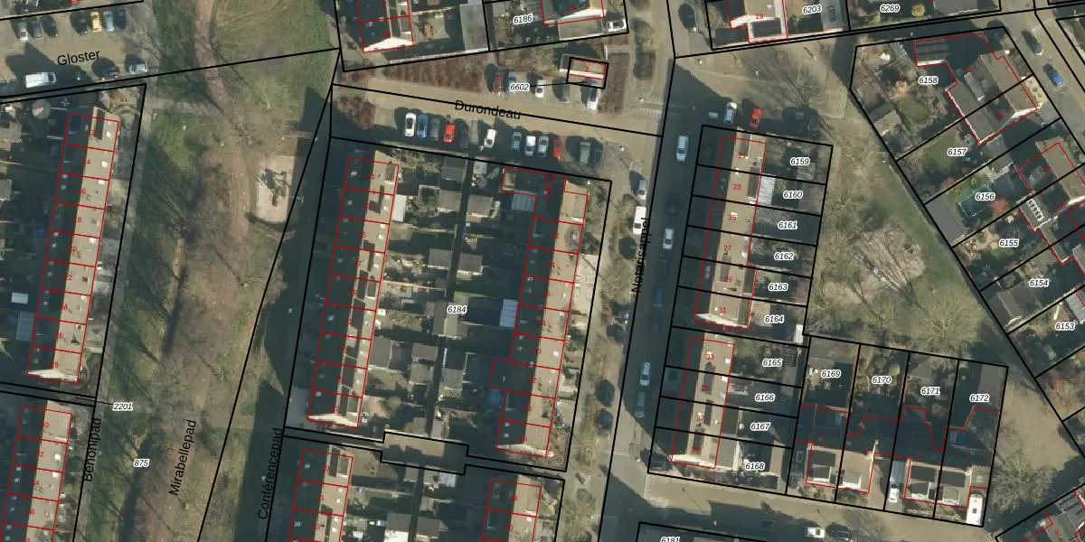 Het adres is gelegen op perceel 6184 in de sectie D en de kadastrale gemeente Tiel. De kadastrale aanduiding is aldus TIE00-D-6184. De oppervlakte van het perceel is 2870 m². Dat is groter dan gemiddeld in Tiel, waar de gemiddelde perceeloppervlakte op 1546,61 m² ligt. Het grootste perceel in de kadastrale gemeente is 26,3 ha. Het kleinste perceel heeft een oppervlakte van 0 m². Op het perceel zijn 18 adressen aanwezig. De huidige grenzen van het perceel zijn digitaal in de Basisregistratie Kadaster (BRK) geregistreerd op 06-04-2004.