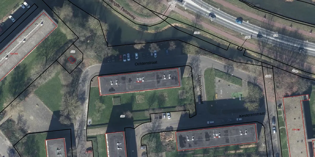 Ochtenstraat 45 is gelegen op kadastraal perceel TIE00M180. Deze kadastrale aanduiding is uniek en wordt gebruikt door het Kadaster om eigendomsrechten en andere zakelijke rechten vast te leggen. Het perceel maakt onderdeel uit van de kadastrale gemeente Tiel.