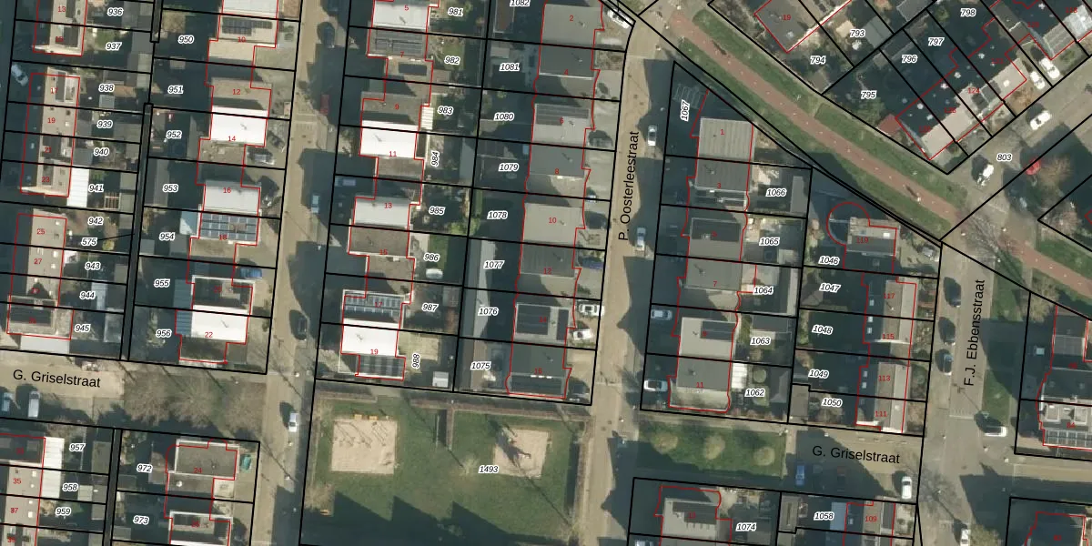 P. Oosterleestraat 12 is gelegen op kadastraal perceel TIE00K1077. Deze kadastrale aanduiding is uniek en wordt gebruikt door het Kadaster om eigendomsrechten en andere zakelijke rechten vast te leggen. Het perceel maakt onderdeel uit van de kadastrale gemeente Tiel.