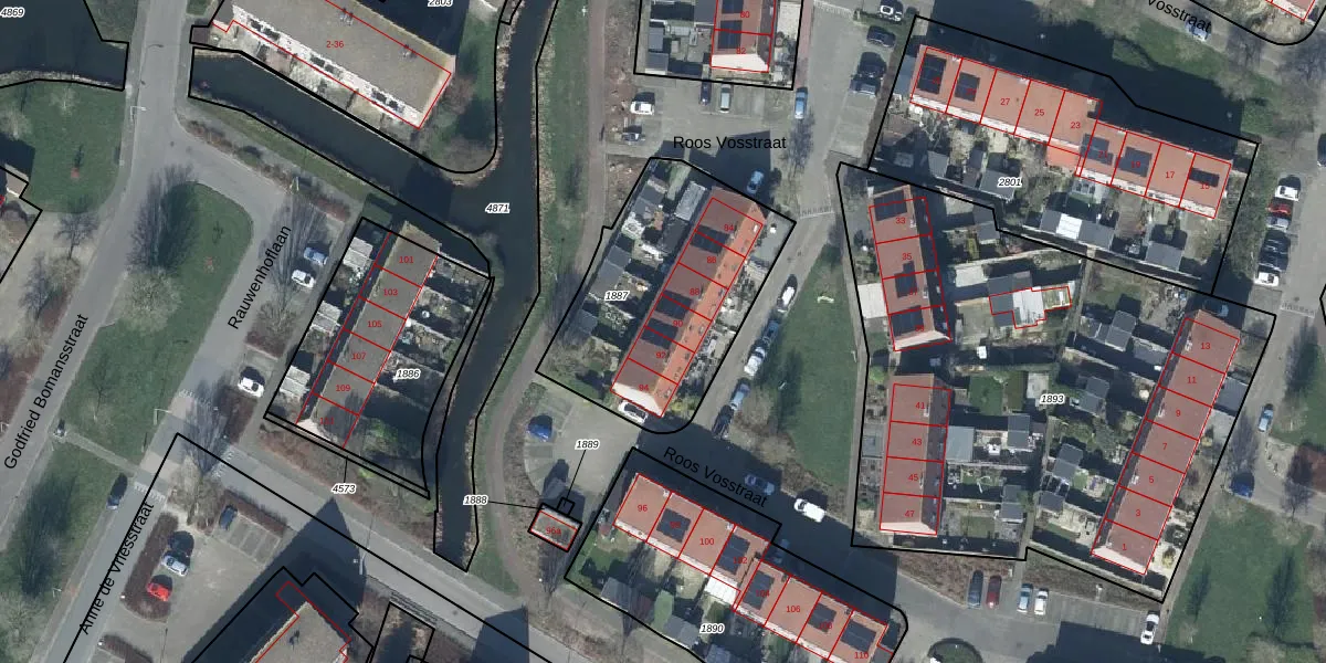 Het perceel waarop Roos Vosstraat 90 staat heeft een oppervlakte van 910 m². Dit is een groot perceel. De perceeloppervlakte wordt geregistreerd door het Kadaster. Gedetailleerde informatie over de maten van dit perceel kunt u vinden in het rapport Kadastrale kaart met maatvoering van Roos Vosstraat 90.
