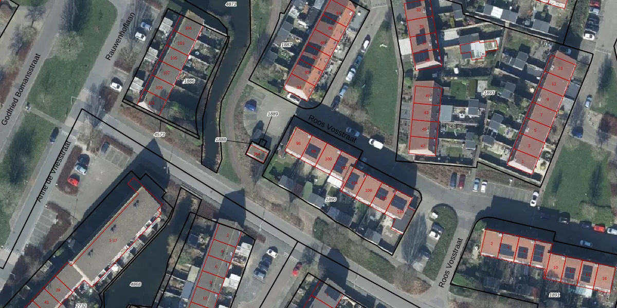 Het perceel waarop Roos Vosstraat 98 staat heeft een oppervlakte van 1090 m². Dit is een zeer groot perceel. De perceeloppervlakte wordt geregistreerd door het Kadaster. Gedetailleerde informatie over de maten van dit perceel kunt u vinden in het rapport Kadastrale kaart met maatvoering van Roos Vosstraat 98.