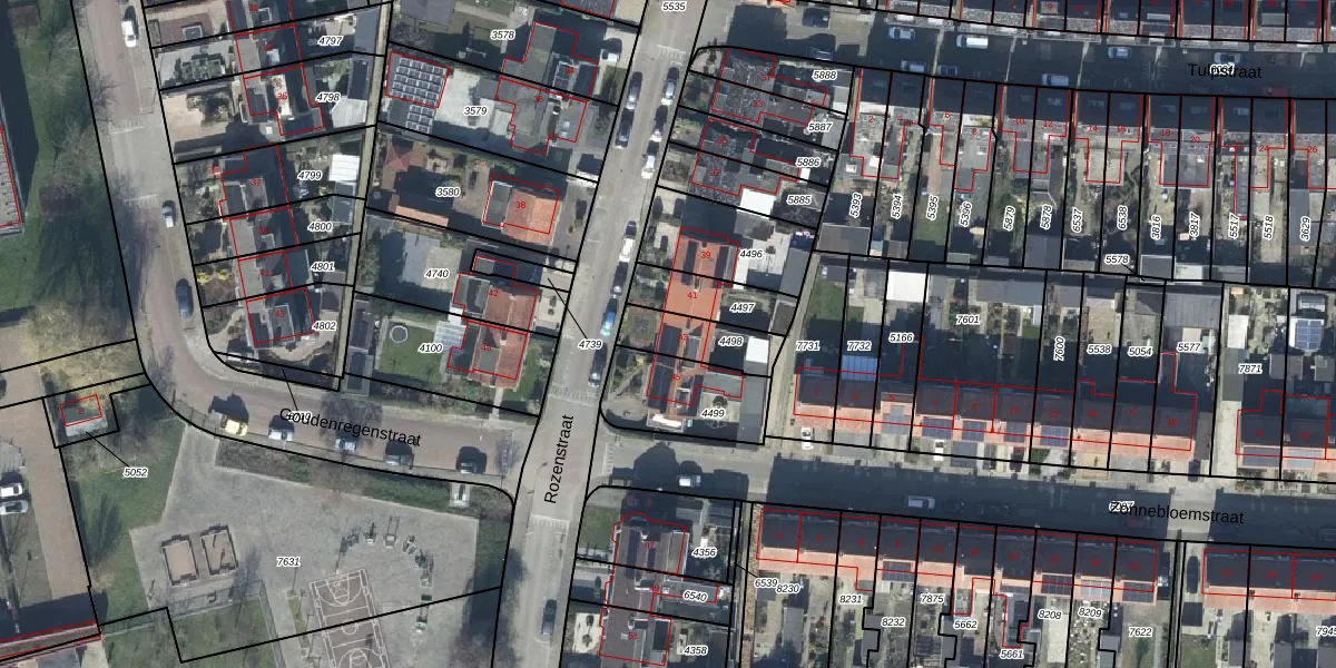 Rozenstraat 43 is gelegen op kadastraal perceel TIE00D4498. Deze kadastrale aanduiding is uniek en wordt gebruikt door het Kadaster om eigendomsrechten en andere zakelijke rechten vast te leggen. Het perceel maakt onderdeel uit van de kadastrale gemeente Tiel.