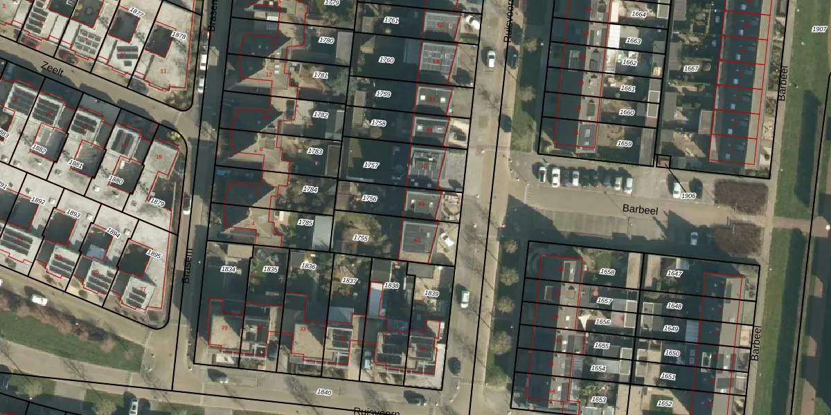 Het perceel waarop Ruisvoorn 45 staat heeft een oppervlakte van 223 m². Dit is een middelgroot perceel. De perceeloppervlakte wordt geregistreerd door het Kadaster. Gedetailleerde informatie over de maten van dit perceel kunt u vinden in het rapport Kadastrale kaart met maatvoering van Ruisvoorn 45.