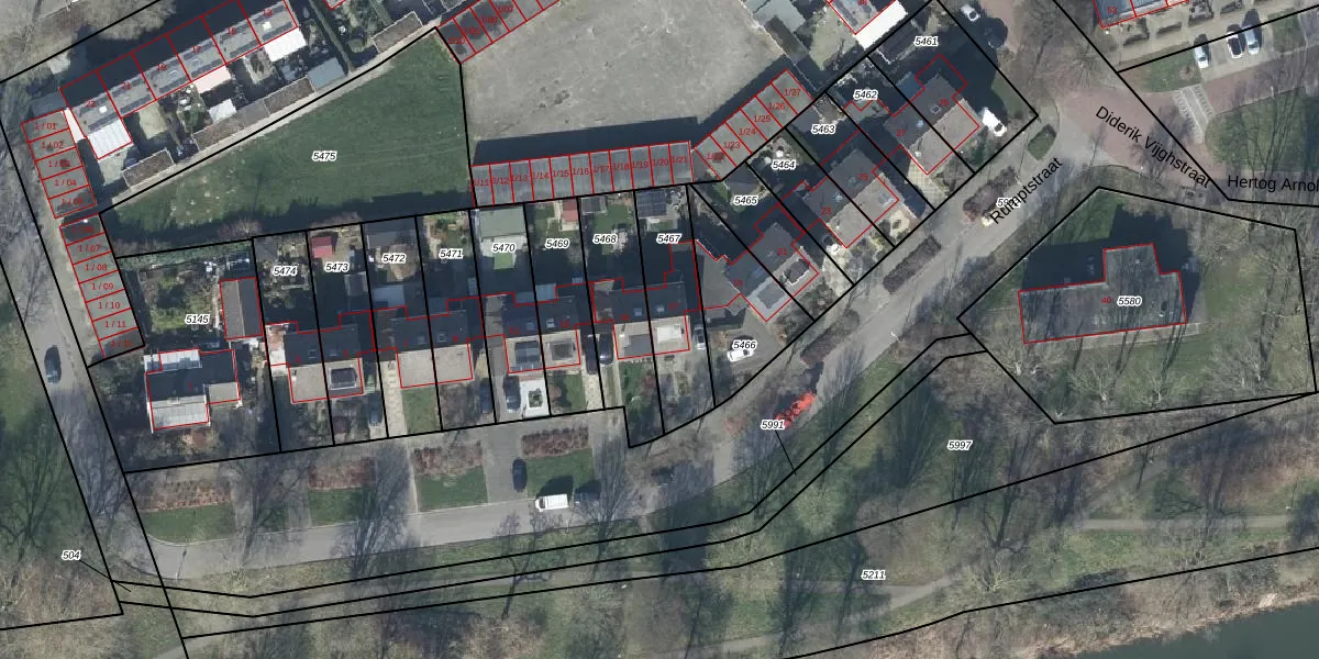 Het adres is gelegen op perceel 5467 in de sectie D en de kadastrale gemeente Tiel. De kadastrale aanduiding is aldus TIE00-D-5467. Het perceel is kleiner dan gemiddeld in Tiel. Het perceel is 296 m² groot, terwijl het gemiddelde ligt op 1549,84 m². Het grootste perceel in de kadastrale gemeente is 26,3 ha. Het kleinste perceel heeft een oppervlakte van 0 m². Op het perceel bevinden zich geen andere adressen. De huidige grenzen van het perceel zijn digitaal in de Basisregistratie Kadaster (BRK) geregistreerd op 28-07-2004.