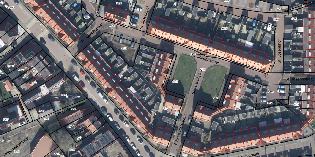 Het perceel waarop St. Josephplein 5 staat heeft een oppervlakte van 2402 m². Dit is een zeer groot perceel. De perceeloppervlakte wordt geregistreerd door het Kadaster. Gedetailleerde informatie over de maten van dit perceel kunt u vinden in het rapport Kadastrale kaart met maatvoering van St. Josephplein 5.