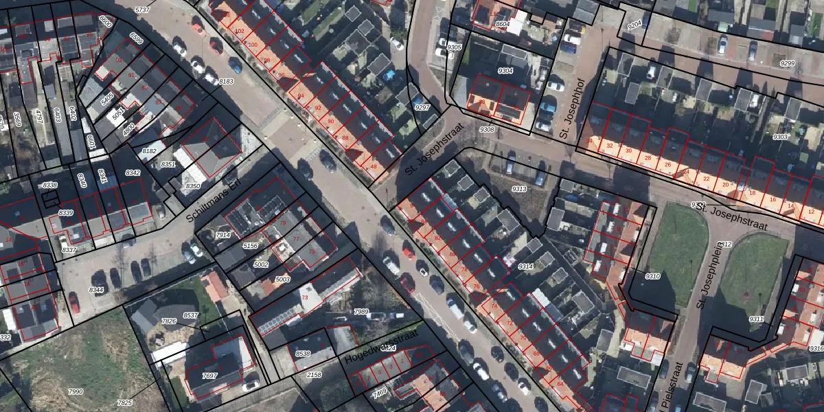 St. Josephstraat 9 is gelegen op kadastraal perceel TIE00C9314. Deze kadastrale aanduiding is uniek en wordt gebruikt door het Kadaster om eigendomsrechten en andere zakelijke rechten vast te leggen. Het perceel maakt onderdeel uit van de kadastrale gemeente Tiel.