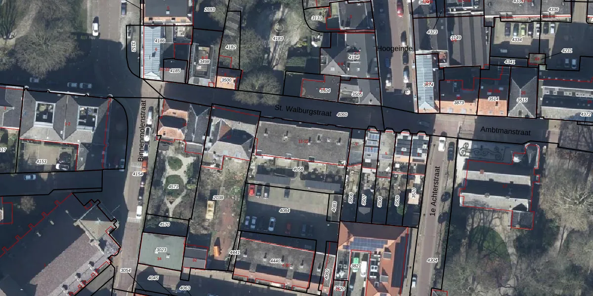 Het perceel waarop St. Walburgstraat 13-21 staat heeft een oppervlakte van 730 m². Dit is een groot perceel. De perceeloppervlakte wordt geregistreerd door het Kadaster. Gedetailleerde informatie over de maten van dit perceel kunt u vinden in het rapport Kadastrale kaart met maatvoering van St. Walburgstraat 13-21.