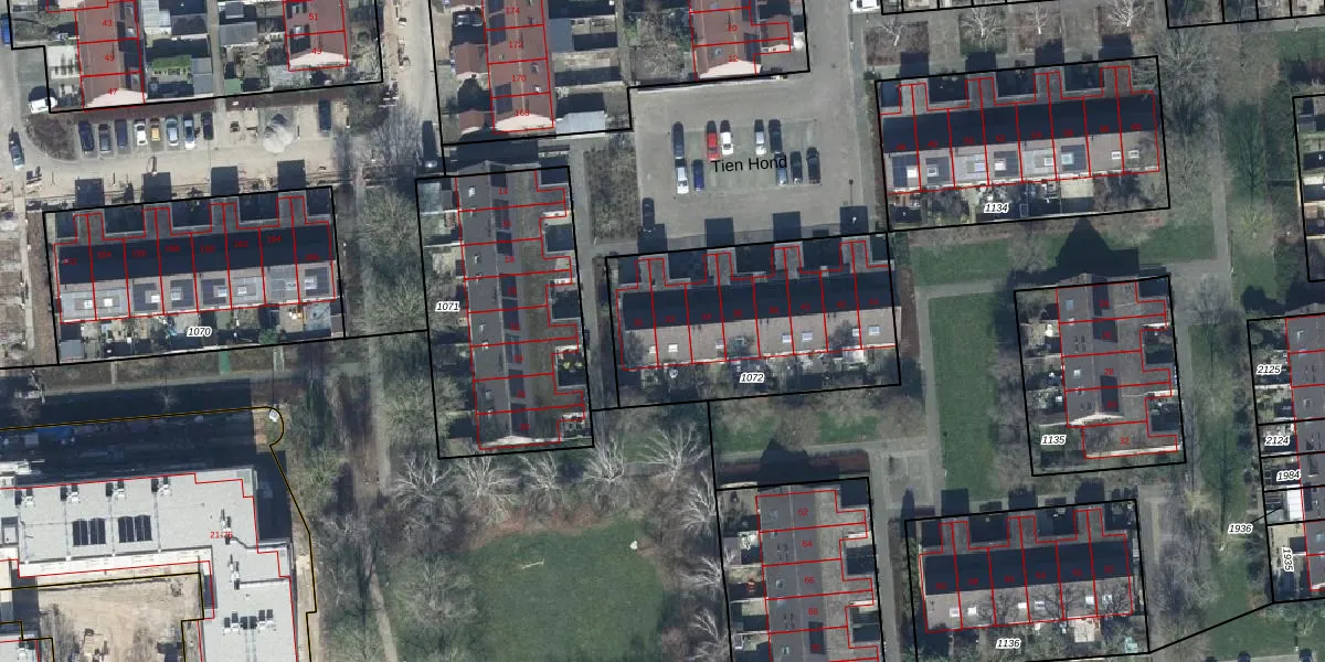 Tien Hond 32 is gelegen op kadastraal perceel TIE00G1072. Deze kadastrale aanduiding is uniek en wordt gebruikt door het Kadaster om eigendomsrechten en andere zakelijke rechten vast te leggen. Het perceel maakt onderdeel uit van de kadastrale gemeente Tiel.