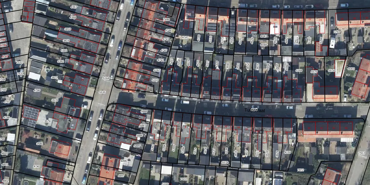 Tulpstraat 5 is gelegen op kadastraal perceel TIE00D4619. Deze kadastrale aanduiding is uniek en wordt gebruikt door het Kadaster om eigendomsrechten en andere zakelijke rechten vast te leggen. Het perceel maakt onderdeel uit van de kadastrale gemeente Tiel.