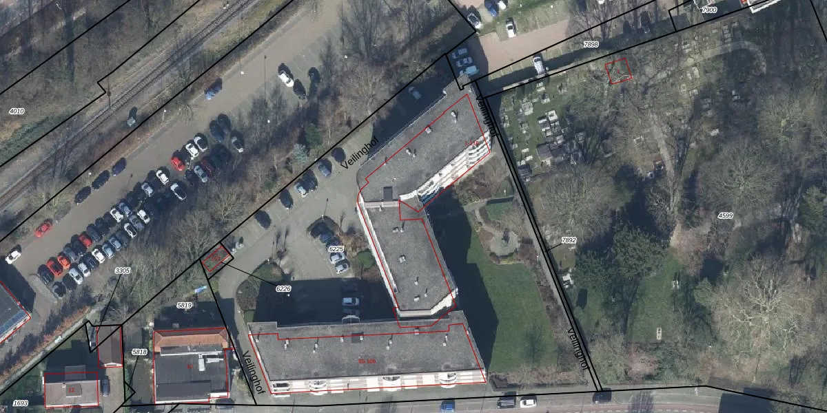 Het perceel waarop Veilinghof 63 staat heeft een oppervlakte van 4983 m². Dit is een zeer groot perceel. De perceeloppervlakte wordt geregistreerd door het Kadaster. Gedetailleerde informatie over de maten van dit perceel kunt u vinden in het rapport Kadastrale kaart met maatvoering van Veilinghof 63.
