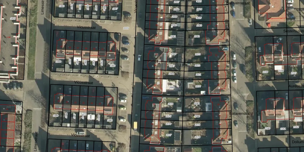 Het perceel waarop Vicusstraat 24 staat heeft een oppervlakte van 156 m². Dit is een middelgroot perceel. De perceeloppervlakte wordt geregistreerd door het Kadaster. Gedetailleerde informatie over de maten van dit perceel kunt u vinden in het rapport Kadastrale kaart met maatvoering van Vicusstraat 24.