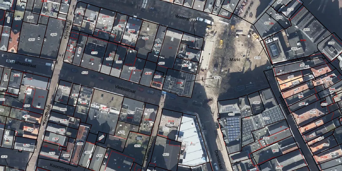 Vleesstraat 33 is gelegen op kadastraal perceel TIE00E3674. Deze kadastrale aanduiding is uniek en wordt gebruikt door het Kadaster om eigendomsrechten en andere zakelijke rechten vast te leggen. Het perceel maakt onderdeel uit van de kadastrale gemeente Tiel.