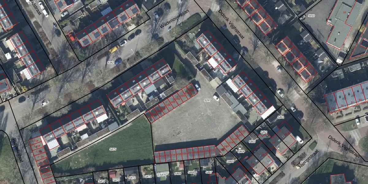 Het perceel waarop Wadenoijenlaan 1-02 staat heeft een oppervlakte van 5830 m². Dit is een zeer groot perceel. De perceeloppervlakte wordt geregistreerd door het Kadaster. Gedetailleerde informatie over de maten van dit perceel kunt u vinden in het rapport Kadastrale kaart met maatvoering van Wadenoijenlaan 1-02.