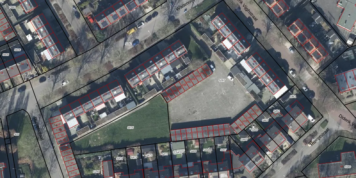 Het perceel waarop Wadenoijenlaan 1-07 staat heeft een oppervlakte van 5830 m². Dit is een zeer groot perceel. De perceeloppervlakte wordt geregistreerd door het Kadaster. Gedetailleerde informatie over de maten van dit perceel kunt u vinden in het rapport Kadastrale kaart met maatvoering van Wadenoijenlaan 1-07.