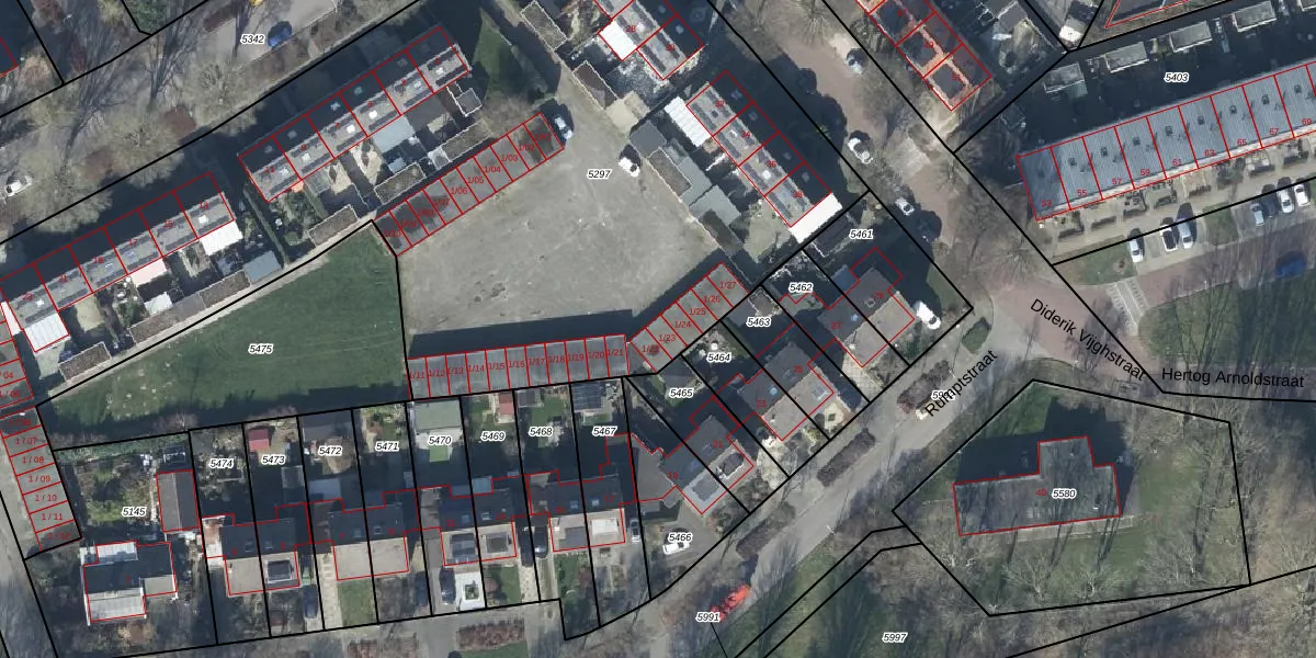 Het perceel waarop Wadenoijenlaan 1-23 staat heeft een oppervlakte van 5830 m². Dit is een zeer groot perceel. De perceeloppervlakte wordt geregistreerd door het Kadaster. Gedetailleerde informatie over de maten van dit perceel kunt u vinden in het rapport Kadastrale kaart met maatvoering van Wadenoijenlaan 1-23.