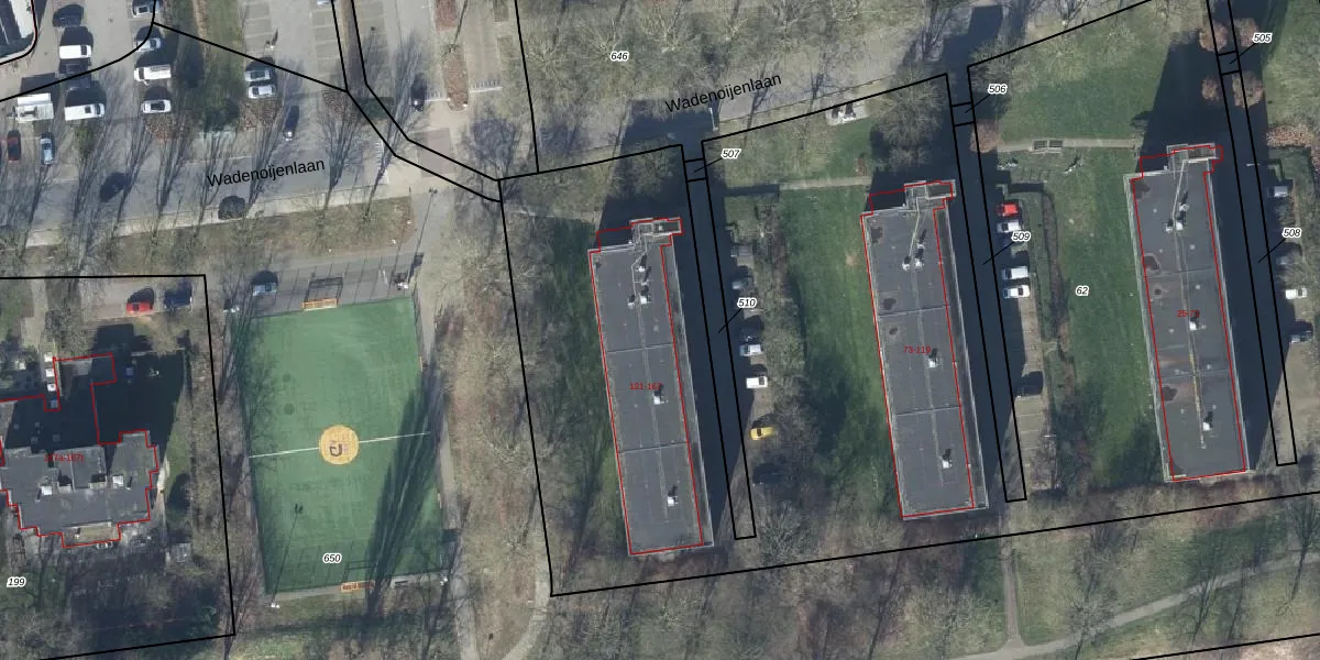 Het perceel waarop Wadenoijenlaan 121-04 staat heeft een oppervlakte van 8965 m². Dit is een zeer groot perceel. De perceeloppervlakte wordt geregistreerd door het Kadaster. Gedetailleerde informatie over de maten van dit perceel kunt u vinden in het rapport Kadastrale kaart met maatvoering van Wadenoijenlaan 121-04.