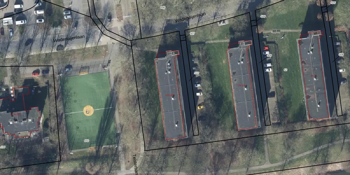 Het perceel waarop Wadenoijenlaan 121-05 staat heeft een oppervlakte van 8965 m². Dit is een zeer groot perceel. De perceeloppervlakte wordt geregistreerd door het Kadaster. Gedetailleerde informatie over de maten van dit perceel kunt u vinden in het rapport Kadastrale kaart met maatvoering van Wadenoijenlaan 121-05.