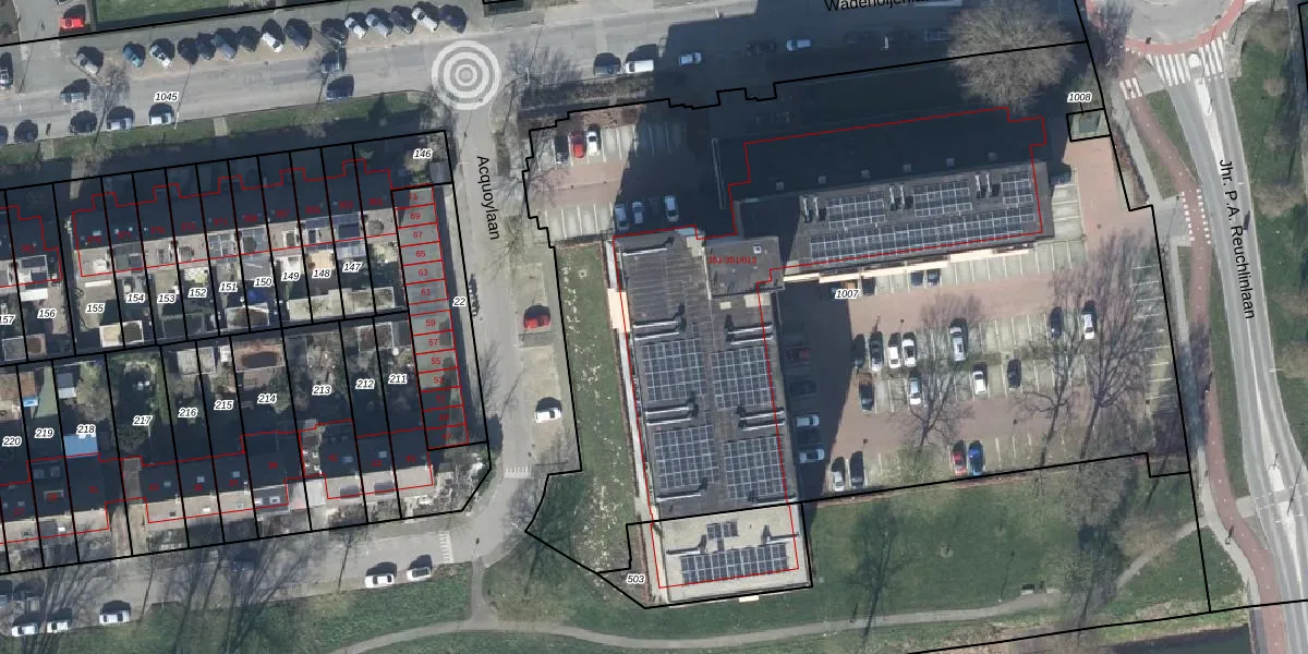 Het perceel waarop Wadenoijenlaan 351-403 staat heeft een oppervlakte van 5869 m². Dit is een zeer groot perceel. De perceeloppervlakte wordt geregistreerd door het Kadaster. Gedetailleerde informatie over de maten van dit perceel kunt u vinden in het rapport Kadastrale kaart met maatvoering van Wadenoijenlaan 351-403.