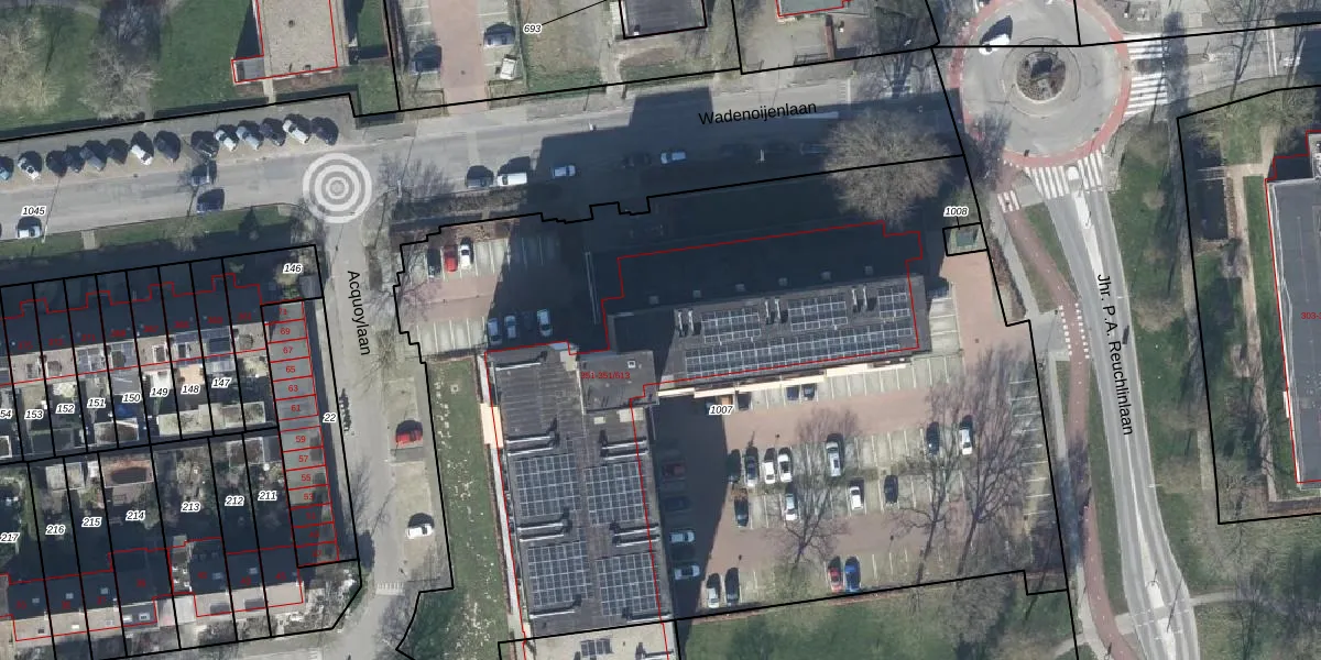 Het perceel waarop Wadenoijenlaan 351-514 staat heeft een oppervlakte van 5869 m². Dit is een zeer groot perceel. De perceeloppervlakte wordt geregistreerd door het Kadaster. Gedetailleerde informatie over de maten van dit perceel kunt u vinden in het rapport Kadastrale kaart met maatvoering van Wadenoijenlaan 351-514.