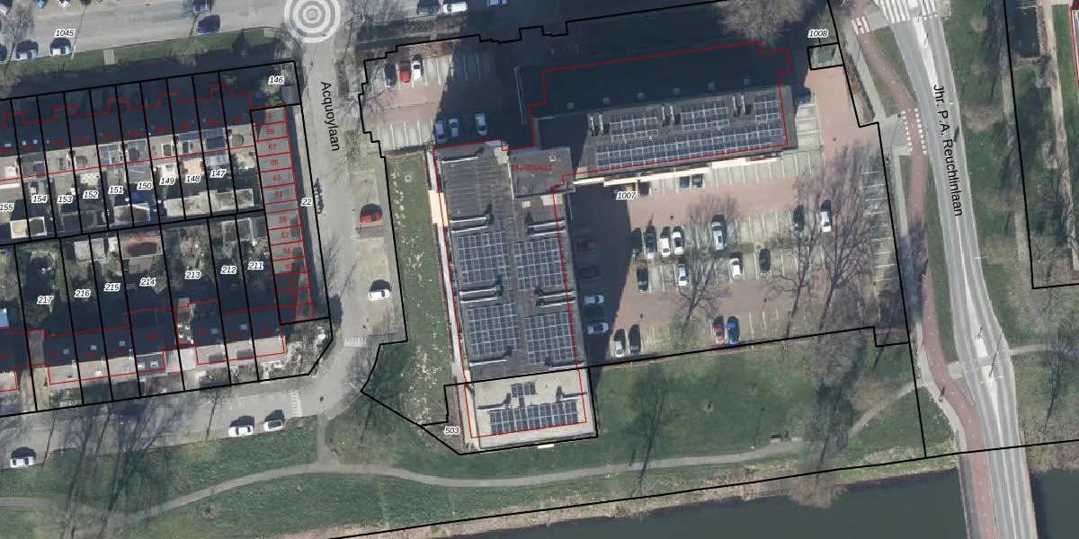 Het perceel waarop Wadenoijenlaan 351-611 staat heeft een oppervlakte van 5869 m². Dit is een zeer groot perceel. De perceeloppervlakte wordt geregistreerd door het Kadaster. Gedetailleerde informatie over de maten van dit perceel kunt u vinden in het rapport Kadastrale kaart met maatvoering van Wadenoijenlaan 351-611.