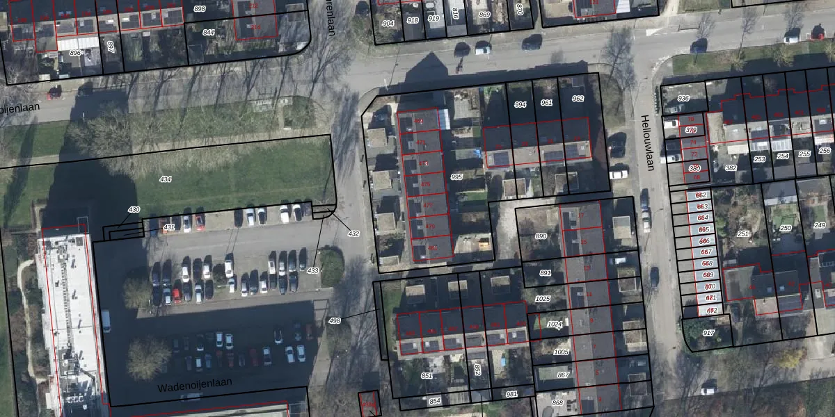 Het perceel waarop Wadenoijenlaan 477 staat heeft een oppervlakte van 1376 m². Dit is een zeer groot perceel. De perceeloppervlakte wordt geregistreerd door het Kadaster. Gedetailleerde informatie over de maten van dit perceel kunt u vinden in het rapport Kadastrale kaart met maatvoering van Wadenoijenlaan 477.