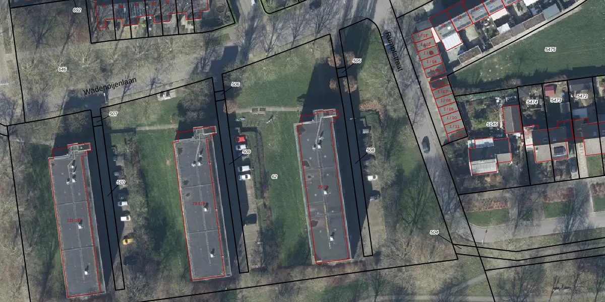 Het perceel waarop Wadenoijenlaan 63 staat heeft een oppervlakte van 8965 m². Dit is een zeer groot perceel. De perceeloppervlakte wordt geregistreerd door het Kadaster. Gedetailleerde informatie over de maten van dit perceel kunt u vinden in het rapport Kadastrale kaart met maatvoering van Wadenoijenlaan 63.