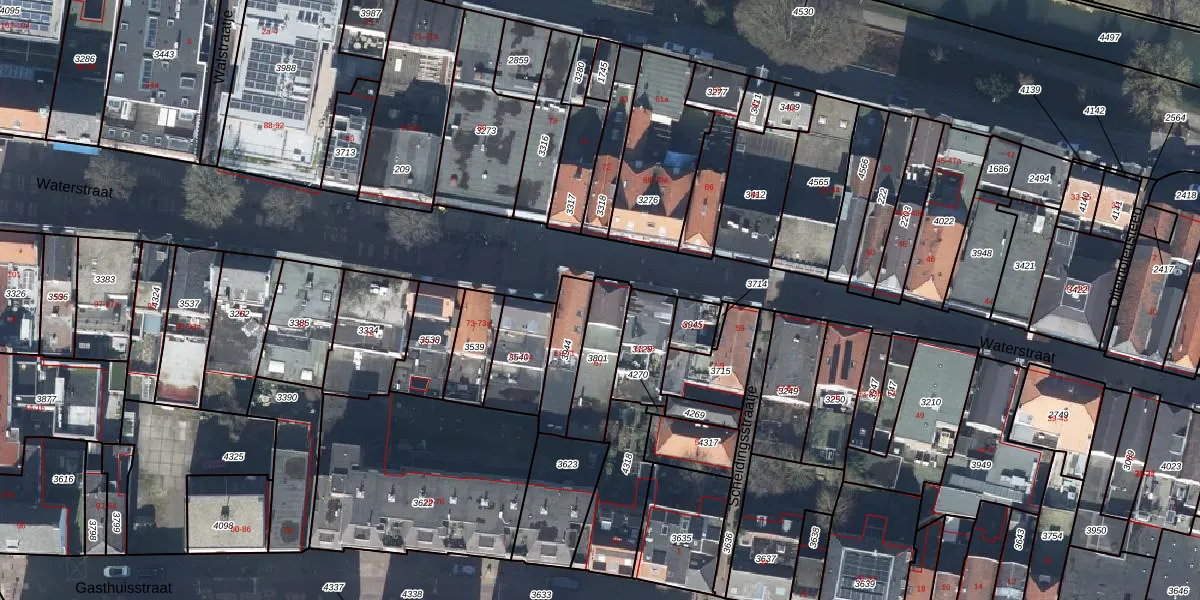 Het perceel waarop Waterstraat 67 staat heeft een oppervlakte van 182 m². Dit is een middelgroot perceel. De perceeloppervlakte wordt geregistreerd door het Kadaster. Gedetailleerde informatie over de maten van dit perceel kunt u vinden in het rapport Kadastrale kaart met maatvoering van Waterstraat 67.