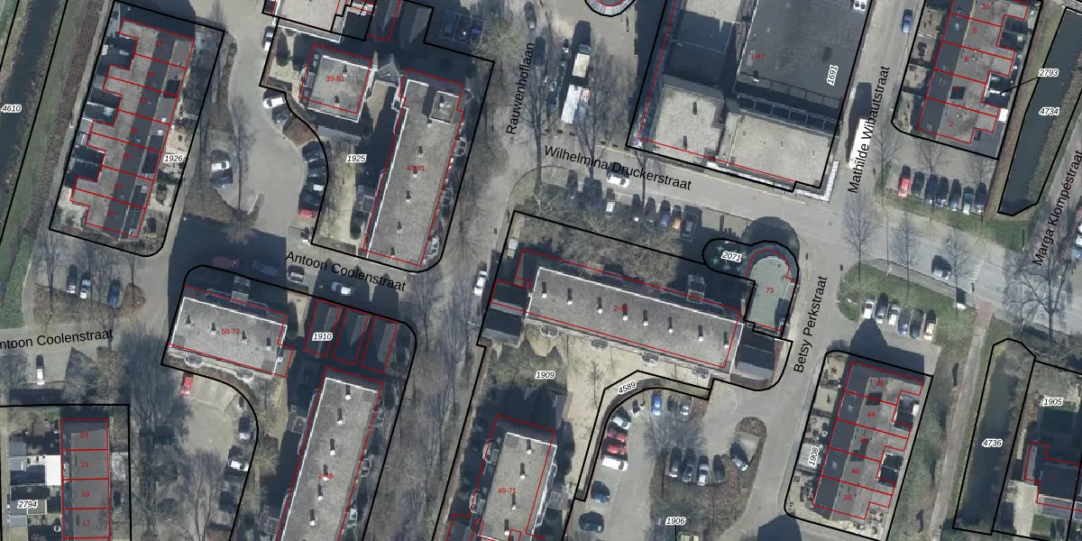 Het perceel waarop Wilhelmina Druckerstraat 2 staat heeft een oppervlakte van 2110 m². Dit is een zeer groot perceel. De perceeloppervlakte wordt geregistreerd door het Kadaster. Gedetailleerde informatie over de maten van dit perceel kunt u vinden in het rapport Kadastrale kaart met maatvoering van Wilhelmina Druckerstraat 2.
