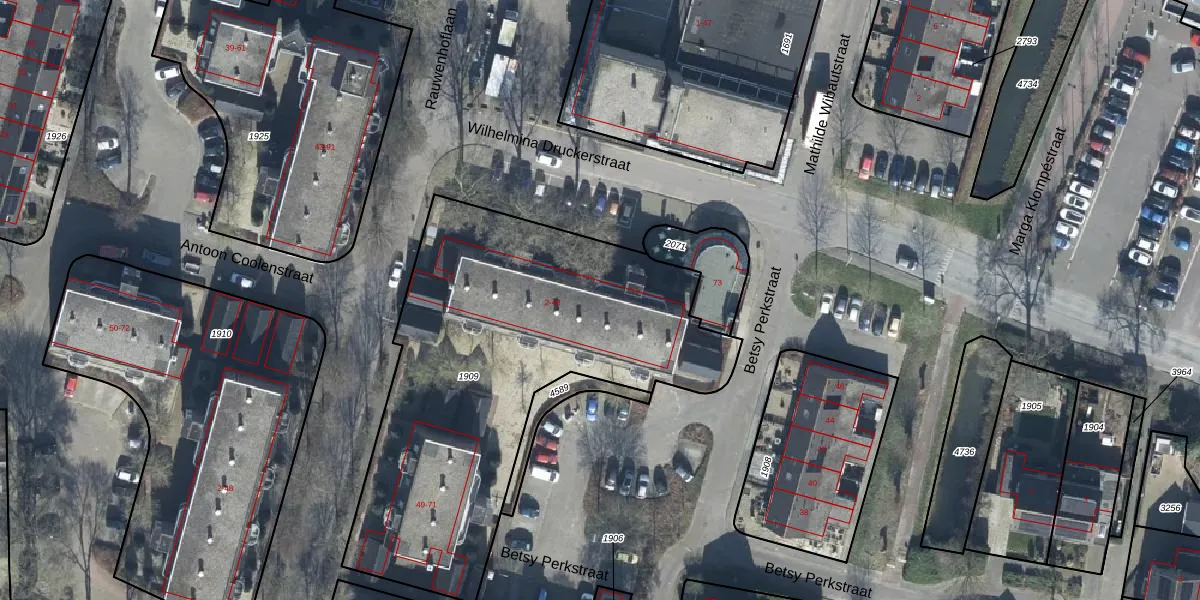 Het perceel waarop Wilhelmina Druckerstraat 28 staat heeft een oppervlakte van 2110 m². Dit is een zeer groot perceel. De perceeloppervlakte wordt geregistreerd door het Kadaster. Gedetailleerde informatie over de maten van dit perceel kunt u vinden in het rapport Kadastrale kaart met maatvoering van Wilhelmina Druckerstraat 28.