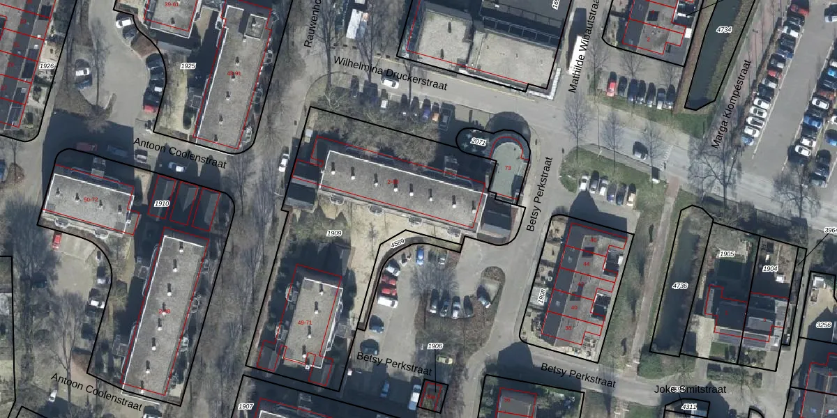 Het perceel waarop Wilhelmina Druckerstraat 44 staat heeft een oppervlakte van 2110 m². Dit is een zeer groot perceel. De perceeloppervlakte wordt geregistreerd door het Kadaster. Gedetailleerde informatie over de maten van dit perceel kunt u vinden in het rapport Kadastrale kaart met maatvoering van Wilhelmina Druckerstraat 44.