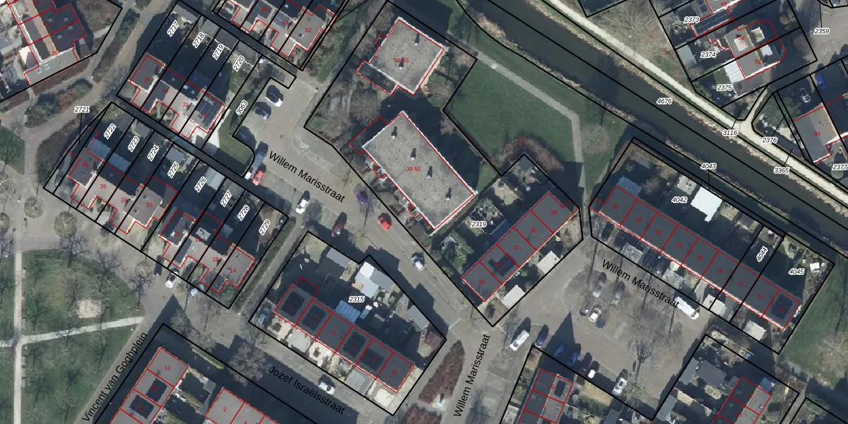 Willem Marisstraat 38 is gelegen op kadastraal perceel TIE00H2319. Deze kadastrale aanduiding is uniek en wordt gebruikt door het Kadaster om eigendomsrechten en andere zakelijke rechten vast te leggen. Het perceel maakt onderdeel uit van de kadastrale gemeente Tiel.