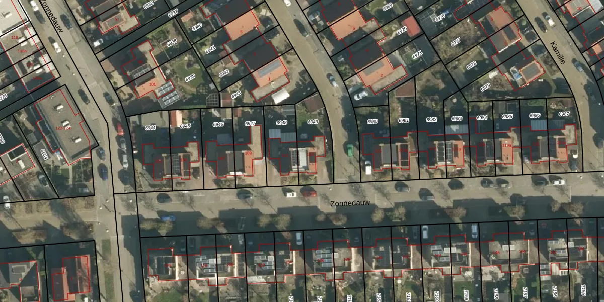 Zonnedauw 113 is gelegen op kadastraal perceel TIE00D6949. Deze kadastrale aanduiding is uniek en wordt gebruikt door het Kadaster om eigendomsrechten en andere zakelijke rechten vast te leggen. Het perceel maakt onderdeel uit van de kadastrale gemeente Tiel.