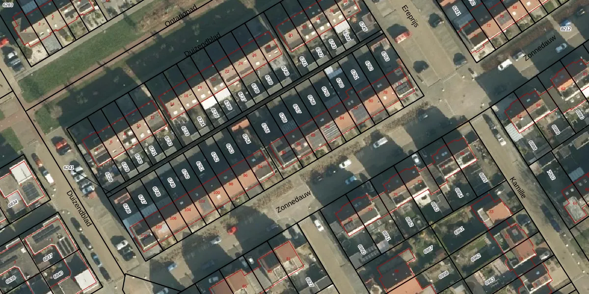 Zonnedauw 90 is gelegen op kadastraal perceel TIE00D6756. Deze kadastrale aanduiding is uniek en wordt gebruikt door het Kadaster om eigendomsrechten en andere zakelijke rechten vast te leggen. Het perceel maakt onderdeel uit van de kadastrale gemeente Tiel.