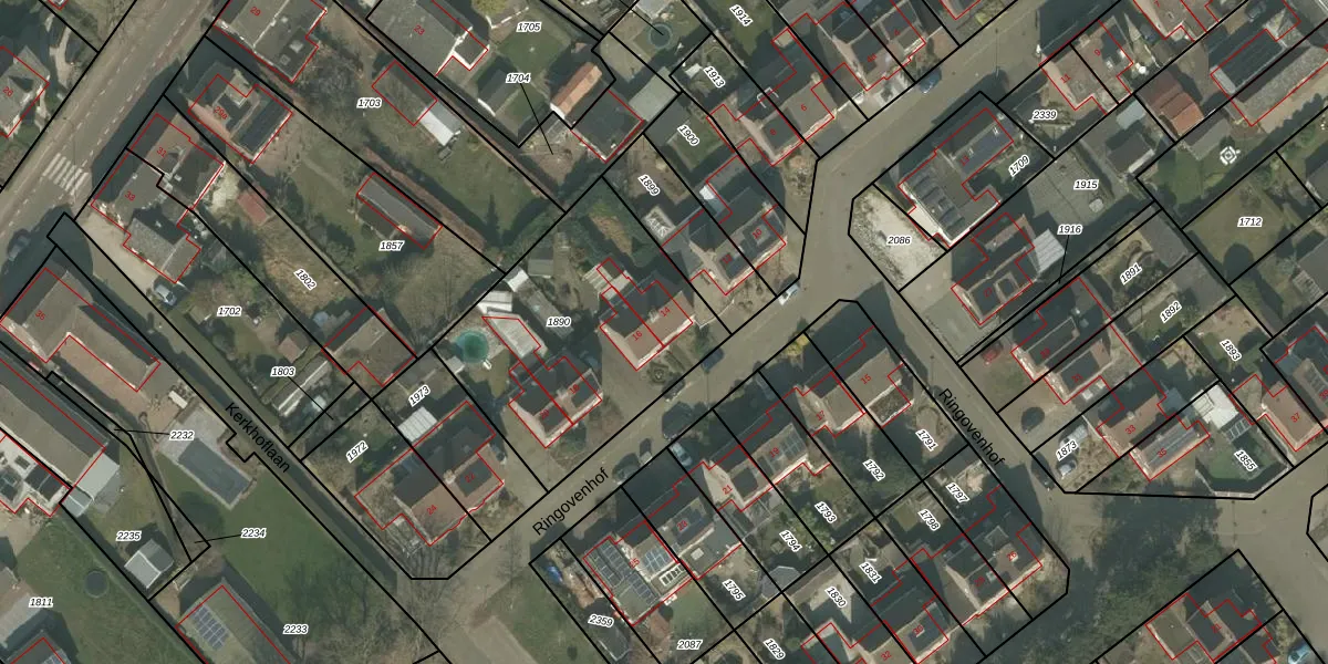 Het perceel waarop Ringovenhof 14 staat heeft een oppervlakte van 1045 m². Dit is een zeer groot perceel. De perceeloppervlakte wordt geregistreerd door het Kadaster. Gedetailleerde informatie over de maten van dit perceel kunt u vinden in het rapport Kadastrale kaart met maatvoering van Ringovenhof 14.