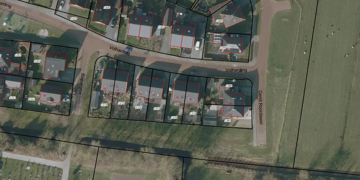 Volharding 30 is gelegen op kadastraal perceel GRD00D1378. Deze kadastrale aanduiding is uniek en wordt gebruikt door het Kadaster om eigendomsrechten en andere zakelijke rechten vast te leggen. Het perceel maakt onderdeel uit van de kadastrale gemeente Gorredijk.