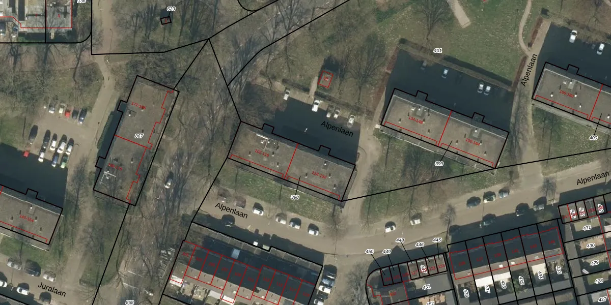 Het perceel waarop Alpenlaan 118 staat heeft een oppervlakte van 526 m². Dit is een groot perceel. De perceeloppervlakte wordt geregistreerd door het Kadaster. Gedetailleerde informatie over de maten van dit perceel kunt u vinden in het rapport Kadastrale kaart met maatvoering van Alpenlaan 118.